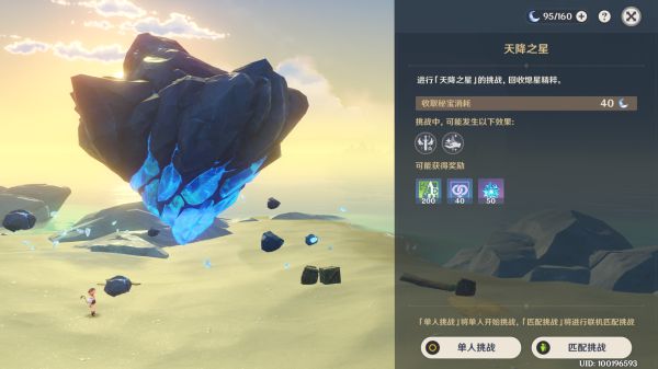 在「天降之星」挑战中,击败魔物可以获得天体能量。能持有的天体能量是有限的,无法取得超出上限部分的能量。在天降之星的下方,可以交付收集到的能量,推进挑战进程。提交的过程中,如果受到攻击,则会中断提交,并损失持有的能量。