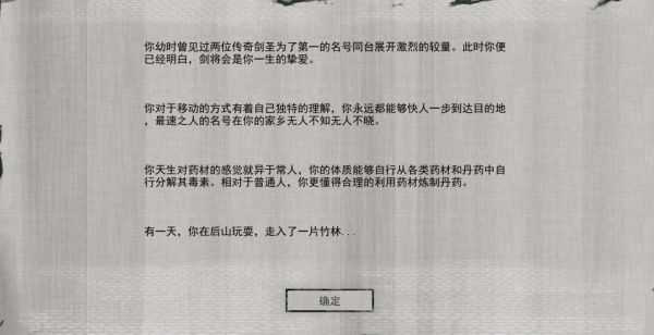 为了能在山中快速的采到诸多药材,我便求干爹授予我轻功,在我百般求索之下,终于给了我一本【疾风迅雷】秘籍,我废寝忘食,刻苦钻研,耗时8天便练得此轻功,父亲惊叹:“你小子竟能如此快速学会此功法,常人每日每夜修炼此功也要耗费15天,甚者一月有余,孺子可教,孺子可教也,哈哈哈”“谢父亲,都是父亲从小教导的好”我满是兴奋的回道,父亲:“既然你有如此天赋,不如步入修仙之道,造福世间百姓”“关于此事,我也准备请求父亲放我出山,修炼的同时寻我生父生母”我单膝跪地,低头且双手抱拳道,父亲见状赶忙扶我:“起来起来,我给予你一本【玄灵剑】秘籍,习得后来后山的森林找我”父亲说完便化作一缕仙气不见踪影。