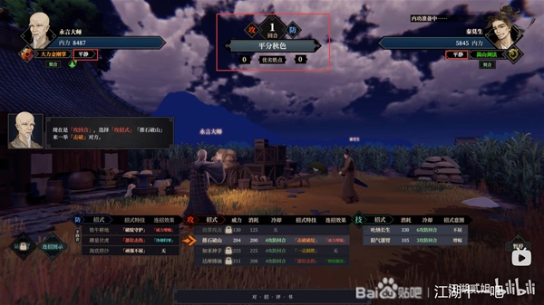 在战斗中我们可以通过打出破绽来快速决定一手心态①,击伤、点穴、中毒、击落、抢夺,只要这些特效触发成功后就可以给对方降低心态,如果身体部位-头面受到伤害的话会持续减少心态以及提高负面心态的增长,击伤、点穴、封脉减少的心态差不多,抢夺武器和击落武器会给对方减少大量的心态。其次就是通过打嘴炮和持续获得胜点,每六回合可以进行一次套路更换,其中也需要进行一次嘴炮攻击,嘴炮攻击是互相的,如下图: