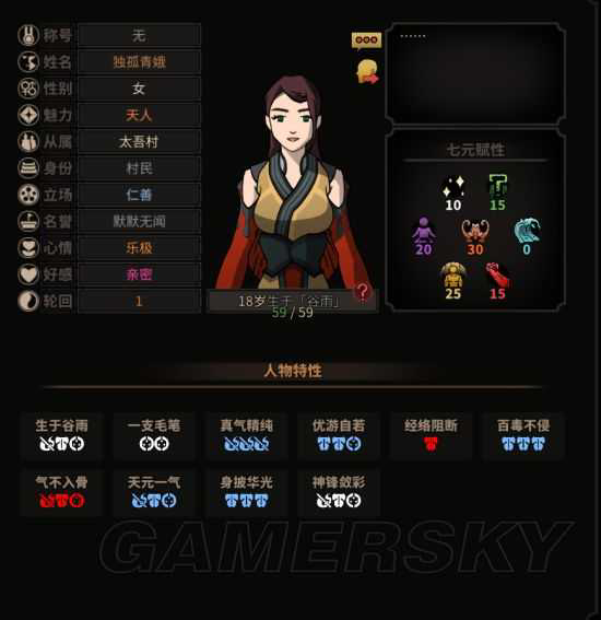 因为特性词条不好,所以不会是我下一代传人。又因为特性词条比较少,所以她的子女特性潜力不是很好(最重要的是没有天元一气的正负词条)