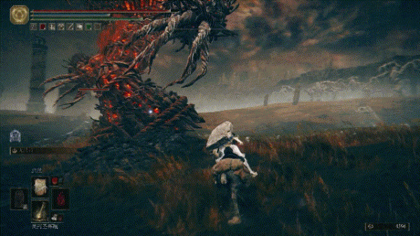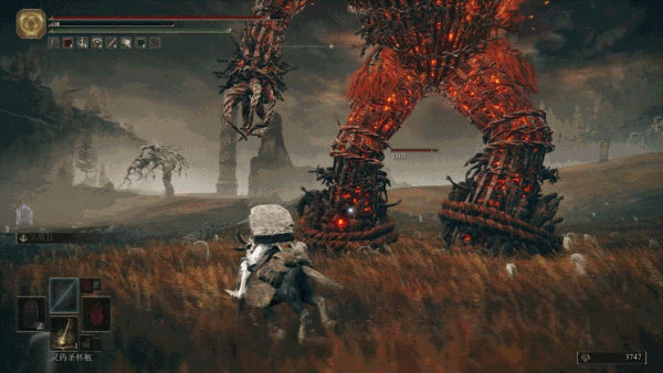 接近火锅巨人时候,它会踢一脚,会飞出大量的火石碎片,要么骑马向侧面跑躲避,要么硬吃伤害靠近。