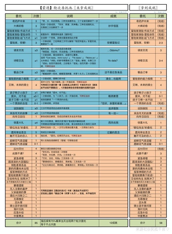 较之前的主要改动在于次数栏里标有“≥”号的,即你只要没拿到对应成就,就会超过这个次数,继续刷该委托,直到你拿到成就。而已经拿到成就的就可以看右边的表格,为每轮固定次数刷取。