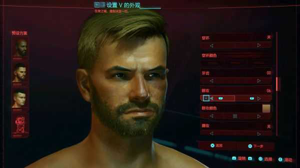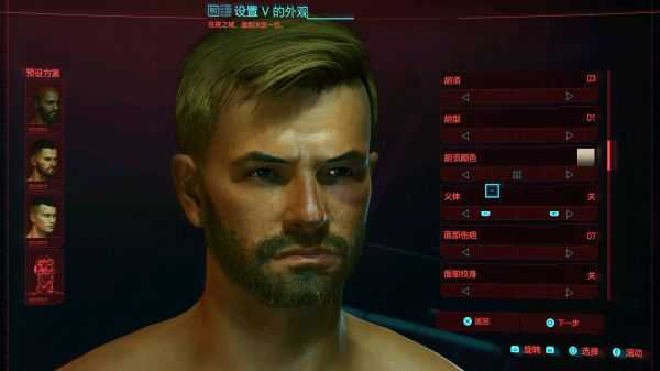 胡须03,胡型01,胡须颜色黄黑色,义体关,面部伤疤07(生病版)当然也可以关(健康版),面部纹身关。