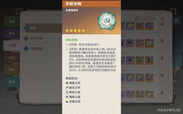 绫人的圣遗物选择可以选择余响四件套,该圣遗物套装效果很适合绫人的强化攻击。至于词条选择,根据我们给绫人带的武器主词条进行圣遗物变更,比如专武绫人我们就带爆伤头。杯子我们选择水伤杯,沙漏选择攻击沙,副词条选择我们优先暴击爆伤,其次攻击力。