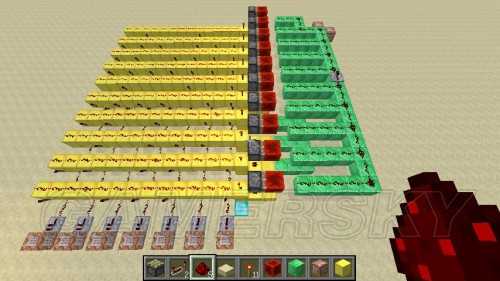 钻石块上的按钮选定第一个加数,绿宝石上的按钮选定第二个加数,当两个加数均选定,就会显示结果。这时按下金块上的清零按钮,所有重置。
