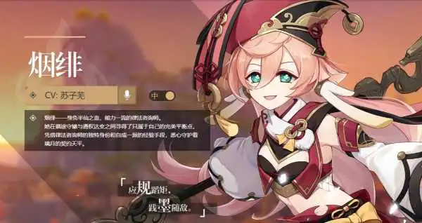 烟绯为火系站场法师主C,蓄力特化角色。依靠频繁蓄力驻场输出,机制可参考天权凝光的输出机制,依靠普攻或技能叠加的“丹火印”为蓄力提供强化。作为火系角色,其伤害上限无疑是得到了保障,与大多数四星主C相比也是可圈可点。但由于烟绯并不具备脱手能力与团队增益技能,与同样是火属性四星角色的香菱相比,保值性有所不及。