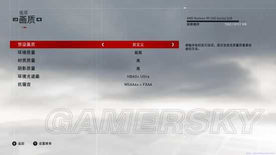 最终我找到了适合我这张A卡的配置,就是将阴影质量和抗锯齿都调整到次高级(第二高),请看我最后一张图。我发现画质比极高好了不少,且帧数可以稳定在45以上,基本保持在55到60.