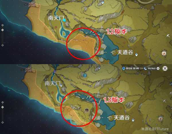 来到任务区域,一个巨大的空洞映入眼帘,从新旧两个版本地图的对比也可以看到,天遒谷与南天门之间新解锁了一块区域,这块区域就是1.3版本新增的首领怪物「古岩龙蜥」的刷新位置。