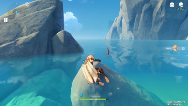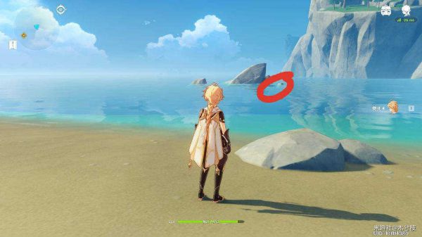 然后我们先游到右边的小石头上(千万不要加速游,耐力不够会淹死在海里)。