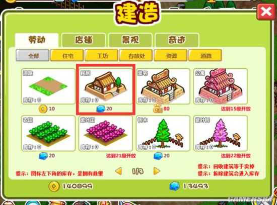 建造经营是《村长打天下》游戏的一大特色,屏幕右下角的“建造”按钮,会弹出“建造界面”。