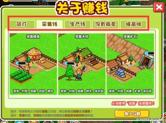 主界面“金币”数量后面的“?”按钮,也可弹出下面的界面,“关于赚钱”。界面内有关于“采集线”“生产线”的详细介绍。“采集线”是关于采集资源的基本要求介绍,生产线是关于生产、贩卖商品的基本要求介绍。