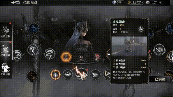 星盘内技能图标,可以看到技能描述。升级技能可以提升技能伤害,重置可免费返还所有技能点。在战技连携内完成装配之后可以看到已装配的技能链以及技能上附带的魂核。