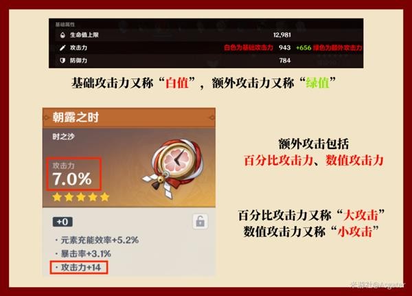 基础攻击力,又称“白值”,目前存在的基础攻击仅有角色自身携带、武器自身携带,是角色攻击力结算的基础。