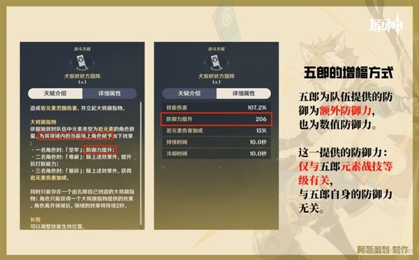 ②.仅与元素战技“犬坂吠吠方圆阵”的等级有关,与五郎的防御力无关