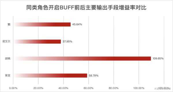 下图是不同角色BUFF技能在相同等级(Lv.9),相同条件(五星0命,四星6命,天赋等级9,武器精1)下的增益率(不包括伤害类型变化带来的增益误差)对比: