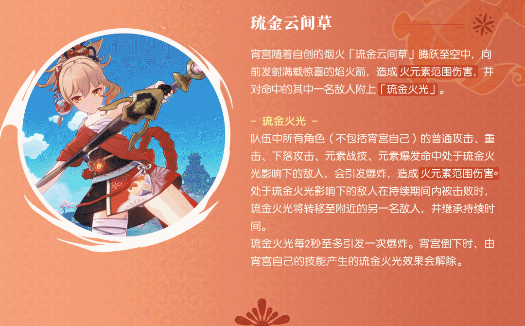 「琉金火光」多用于后台挂火场景,可以用于削减敌人的元素护盾。