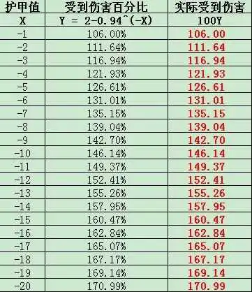 为直观起见,附两张已计算完成的表格(注:假设攻击力为100的情况;篇幅关系,护甲值区间是正负20,之外的有兴趣的同学可以自己去算,负护甲的增伤上限好像是71%)。