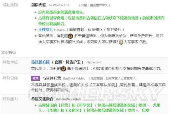 马其顿看似有很多对征服有利的特性,其实只有2个UU和占领奇观回满血的被动有用,其它的作用很低。