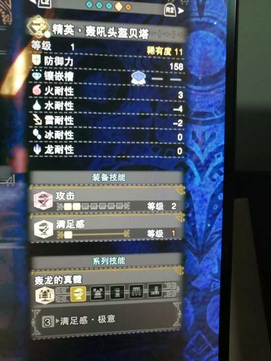 配装的时候发现的,只有头带满足感1,其他都没有满足感技能,黑轰3件套直接满足感2级。