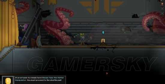 主角上前拾取物质操纵器和镐头,朝着航天飞船。