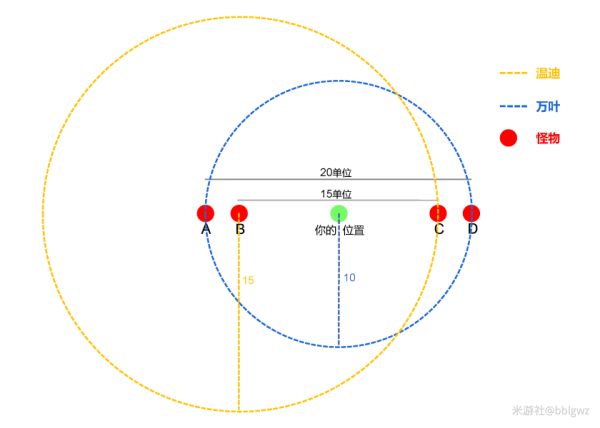 温迪:范围最大,但是引力点会出现在怪物的位置,而不是自身的位置,导致2个怪物直线距离上限为15。图中站在怪物分布中心释放大招,引力点出现在最近锁定怪物B或怪物C的位置,必然存在怪物D或怪物D吸不到的情况。
