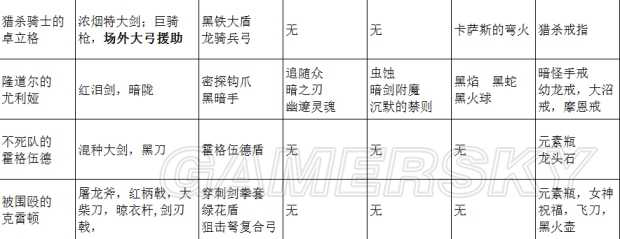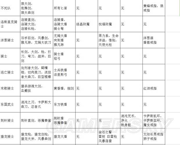 6,各位骑士的装备选择可以查看图表,至少配备两个主手武器和一个副手武器,主手可以都可配备一个小圆盾【目的是双手小圆盾或者副手是战技盾的时候可以弹反,不会出现某个骑士彻底不会弹反】,其余为选用。