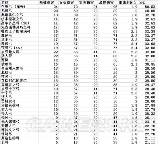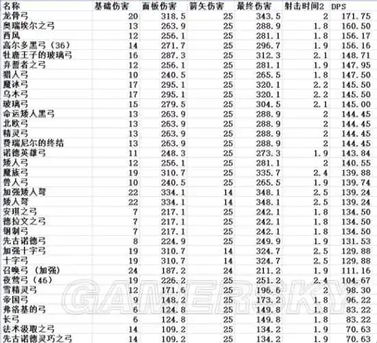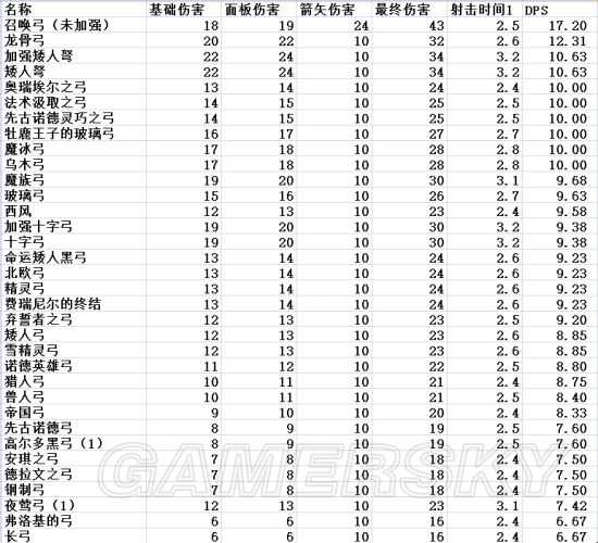 由表中可以看出,召唤弓的输出依旧最高,不过随着其它箭矢质量的提升,差距已逐渐缩小;第二名依旧是龙骨弓;后面几名的差距倒不是很大,用哪一把就见仁见智了。由于射速和箭矢的劣势,弩的排名开始下降