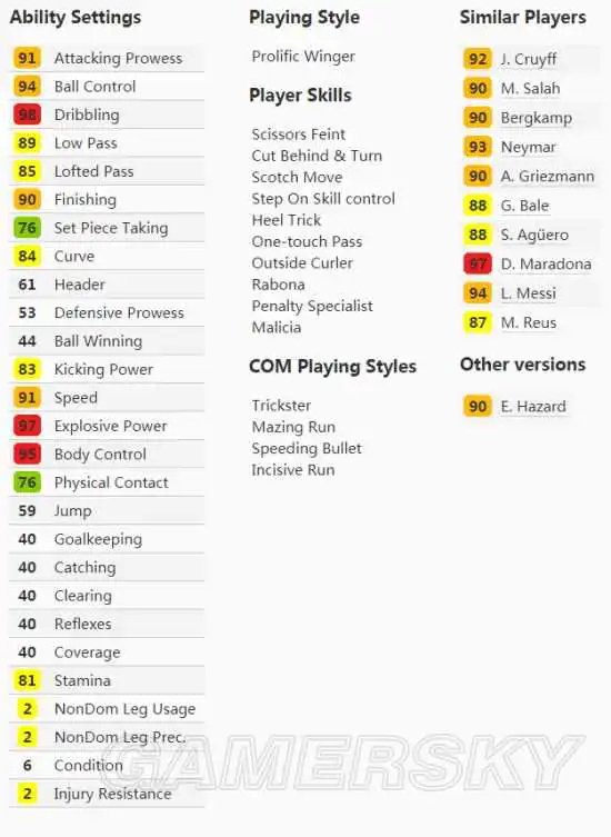 《实况足球2019(PES2019)》MC模式新增了精选球员这一要素,精选球员的评选规则是根据现实足坛的表现来评选的,下面就为大家带来《实况足球2019》阿扎尔精选球员版数据一览,其总评高达94分,具体数据来看下文吧!