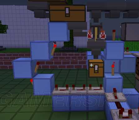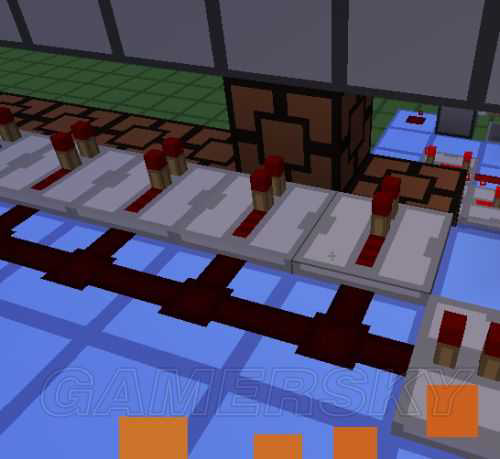那么,绕到后面来说我搭了一根线,链接到后面激活投掷器来实现按一下按钮就自动的给你吧要炼的药材按照顺序来加入炼药机里面去