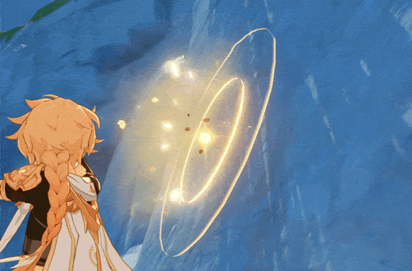 岩元素与水元素反应生成晶片,拾取后可获得水元素护盾(蓝色)