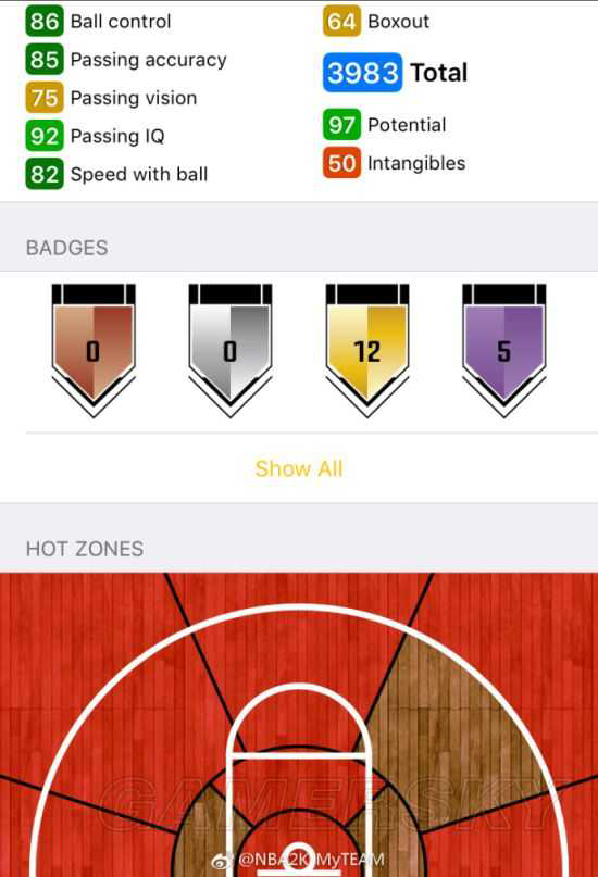 目前梦幻球队毫无疑问的第一3D。变态级别的投射:99空位三分+99受干扰三分+95运球后三分,中投也都是97以上,和之前的钻石雷阿伦不相上下;大锁级别的防守,外线防守属性全部96+;80突扣+双80扣篮倾向,对方盯得太紧,一步突破进去扣篮也很稳;最意外的是给了86运球,对于这个级别的射手还能做Speedboost,基本就相当于作弊了。自带5个紫徽章:接球投篮、底角专家、远距离神射手、无限射程和持球防守精英。