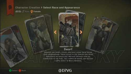 3种职业分别为:擅长剑盾或双手武器的战士(Warrior)、使用弓或匕首的盗贼(Rogue)、擅长各种属性咒语的魔法师(Mage),不过这裡要注意的是由于背景设定上矮人不擅长魔法,所以没有矮人法师这种搭配。