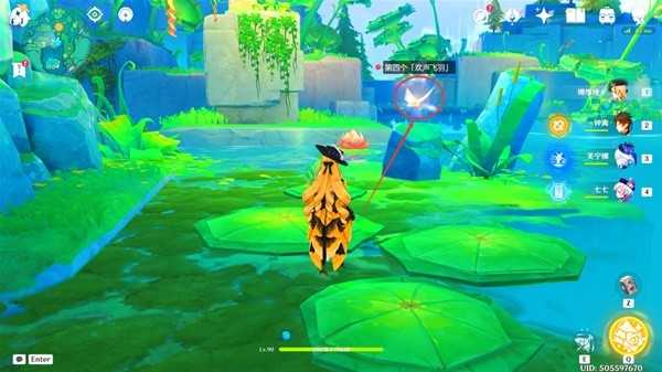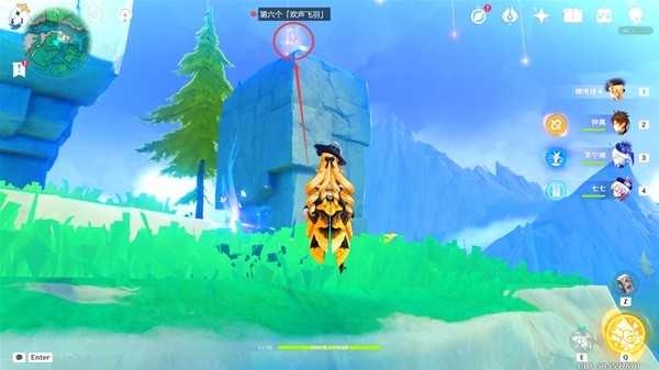 在此处的石头上,可以看到第六个「欢声飞羽」(利用左侧的「跳跃光团」,跳上去触碰即可)