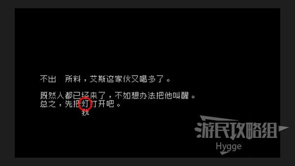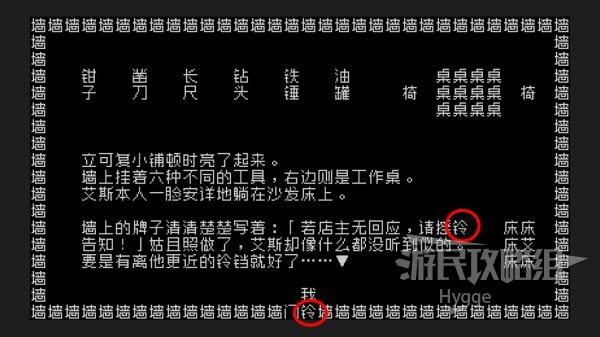 开灯后我们看到小铺的老板也是我们的朋友艾斯正在床上睡觉,为了叫醒他我们先与门边的【铃】互动。发现无法叫醒他后再与新出现的文字中,更加靠近艾斯的【铃】互动即可叫醒他。