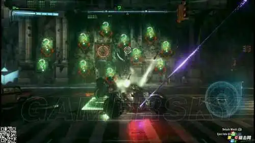 首先正后方有个锚点用绞车勾住充电,再用蝙蝠车压住踏板。类似打地鼠,快速将所有亮起来的问号打掉(这时候只能用R2打)。最后会全亮,连续按方块导弹多重锁定,剩下的再一炮解决。