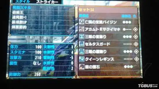 在装了减轻反动的消音器后的面板:210攻击力 30%会心 稍迟换弹速度 稍小反动 三个洞