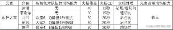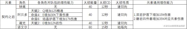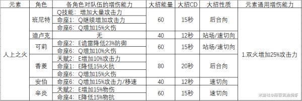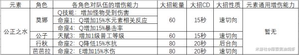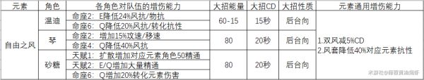 注1:以下能力仅显示各角色特有的可以给队伍其他角色增伤的能力,包含精通/伤害加成/攻击力/减CD/减防御/减抗性/元素伤害/攻速。不包含仅给自己增伤的能力,如迪卢克的命座加伤等,不包含后台类协助性技能,如刹那之花/奥兹/雨帘剑等。