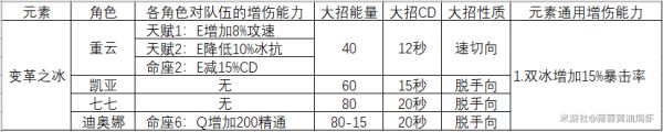 由于整体角色较少以及四个同元素角色弊端太大,本帖仅讨论三个同元素角色阵容思路,其实如双岩双火,双雷双水等等阵容除了吃元素羁绊BUFF外都有解决充能方面的考虑,只是本文更为极端。