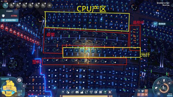 然后是最重要的魔方生产图,先是全部常规资源的产线,整个产区横跨纬度0°45′~26°38′,经度跨度约48°,纬度跨度刚好在南北走向的传送带不拐弯的纬度内(强迫症一本满足)空地较少,土地利用率应该在90%以上。