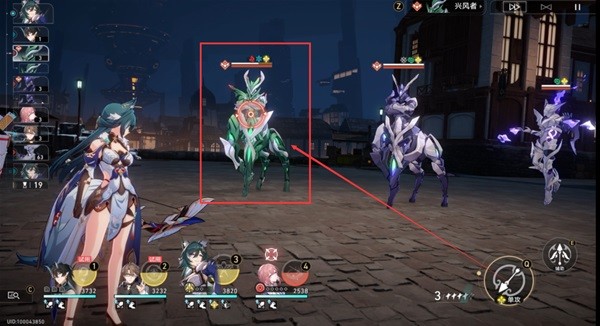 接着饮月三级强普打中间,右边的小怪会直接击破禁锢,两只精英怪剩余的韧性值一样多。接着轮到艾丝妲,艾丝妲可以普攻风人马,因为有火弱点,可以再次削韧。