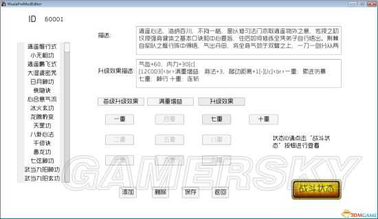 内功编辑界面,左侧有内功按钮,右侧是内功的说明和效果,“满重增益”并排的三个按钮会显示属性增长数据,使用的时候要注意,修改的数据正常一点,特别大或者是负数之类的是无效的~