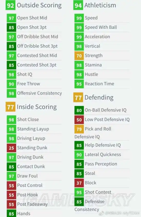 三速是恐怖的99,目前最快的球员没有之一;扣篮凶猛,突扣97+隔扣85+双95扣篮倾向,略显遗憾的是没有隔扣达人紫徽章;97的中投属性毕业级,85的三分属性也能接受。自带4紫徽章和11金徽章,4紫徽章分别是无情终结者、特技演员、抛投大师和单人快攻。