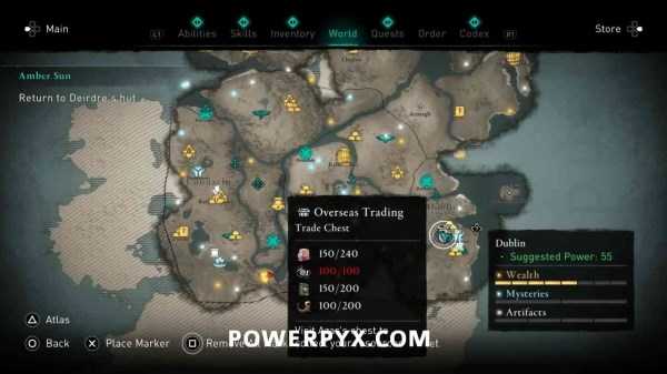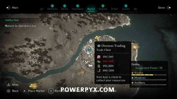 提供给阿扎尔的资源可以通过建立贸易站(地图有标记)获得。这些资源的数量会根据时间推移自动生成,然后可以从都柏林阿扎尔旁边的贸易箱子里取出,每分钟都会自动获得一定数量的资源(甚至根本不用到处跑,可以直接站在箱子前面等它满…)。不同的贸易站生产的资源不同,因此请夺取所有贸易站以保证拥有所有类型的资源。与阿扎尔对话时可以看到不同的贸易合约,需要向她提供一定数量的贸易站资源,提供的资源满足条件后合约就会关闭,并且获得更高的声望以提升声望等级。由于需要大量资源,所有建议尽早解锁所有贸易站,这样在你推主线或进行收集时,贸易箱子就会自动填充。在地图界面可以查看箱子有多少资源,由于储存是有限制的,因此建议每1-2小时将其清空一次。在地图都柏林区域的国王大殿(绿色图标)可以查看当前的声望等级。