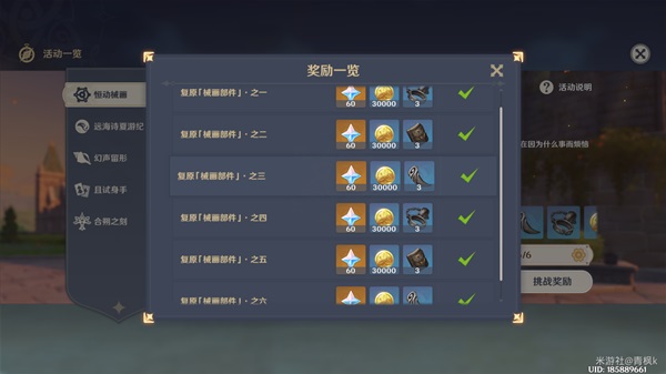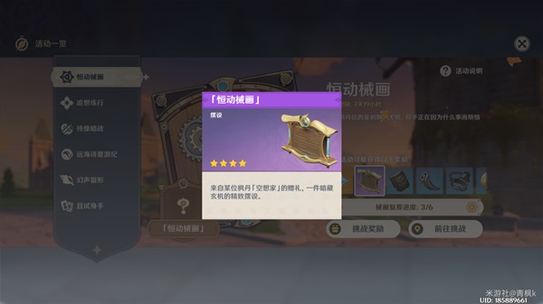 活动期间需要每天会开启一个需要复原的新部件,共计六个,将「械画部件」以正确的角度安置在正确的位置,成功组装出完整的「恒动械画」即可达成要求