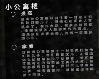 剧情一:土匪,显示危险,从左侧进入地图,三个土匪+1个人质,有时候还有一个疯子,三个锁,带上撬棍,大量食物与药品,还有大量材料,当然,跟别墅一样的BUG,第二次去拿东西算偷。