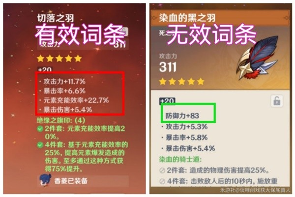 在分析数值之前,我们来讨论一个名词“有效词条”,顾名思义,就是对一个角色有用的词条。比如香菱,双爆、大攻击、精通、充能都是有效词条;防御、生命是无效词条。