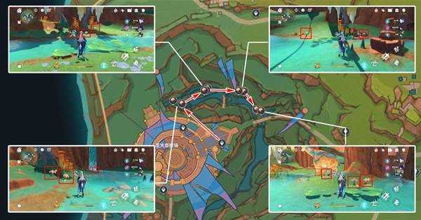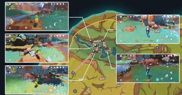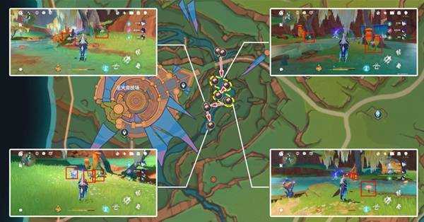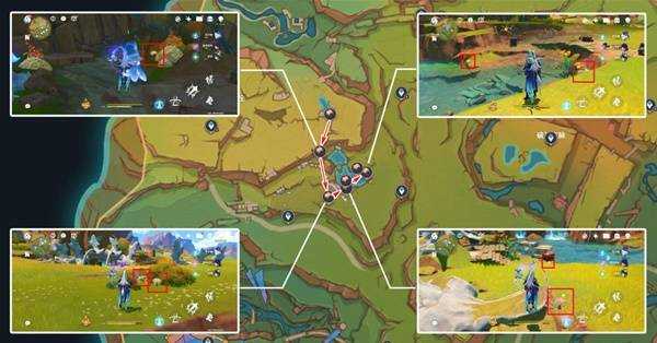 柴薪之丘北方营地附近,所有采集点均在营地内巨大的植物附近。注意左上图采集点远离两处巨大植物。