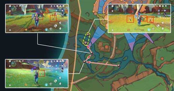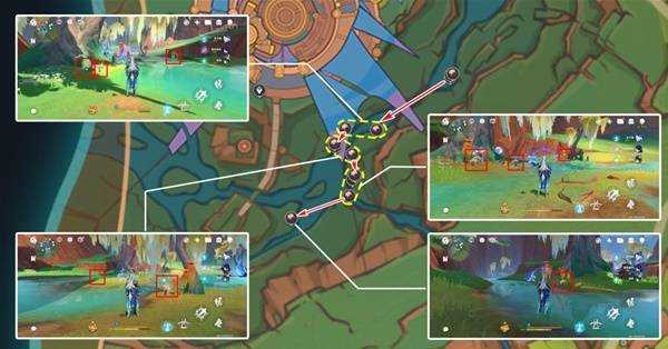从柴薪之丘山顶传送点出发,所有采集点均在柴薪之丘山顶的池塘边,沿着下图路线行进即可。