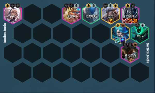 阵容推荐:锤石、泰坦、璐璐(9人口)、芮尔、武器、稻草人、加里奥、盖伦、格温