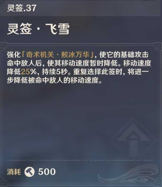 灵签选择:冰水相关,元素精通不选,增幅反应不选,冰优先度高于水,若出现多个可选项,消耗奇术点多的灵签优先。